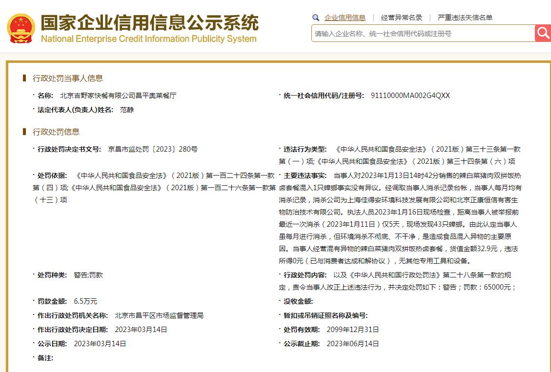 中新網(wǎng)3月15日電 國家企業(yè)信用信息公示系統(tǒng)網(wǎng)站顯示,近日,北京吉野家快餐有限公司昌平奧萊餐廳因違反食品安全法,被北京市昌平區(qū)市場監(jiān)督管理局罰款6.5萬元。
