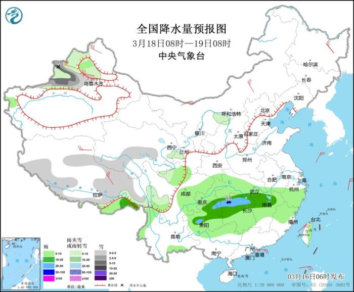 3月18日08時至19日08時,新疆沿天山地區(qū)和西北部、西藏東部和南部、青海中部和南部等地部分地區(qū)有小到中雪或雨夾雪,其中,新疆沿天山地區(qū)等地局地有大雪(5~8毫米)。西藏東南部、貴州中部和東北部、重慶東南部、湖南中北部、湖北東南部、江西北部等地部分地區(qū)有中到大雨,局地暴雨(50~55毫米)。內(nèi)蒙古中部、黑龍江東北部、新疆北部、西藏中部等地部分地區(qū)有4~6級風(fēng)。臺灣海峽將有6~7級、陣風(fēng)8級的東北風(fēng)。