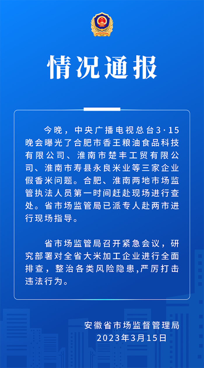 安徽省市場(chǎng)監(jiān)督管理局:已查處三家涉假香米問(wèn)題企業(yè)