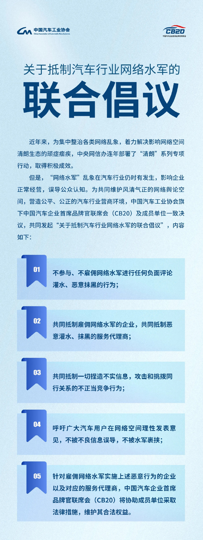 5、針對雇傭網(wǎng)絡水軍實施上述惡意行為的企業(yè)以及對應的服務代理商,中國汽車企業(yè)首席品牌官聯(lián)席會(CB20)將協(xié)助成員單位采取法律措施,維護其合法權益。(完)