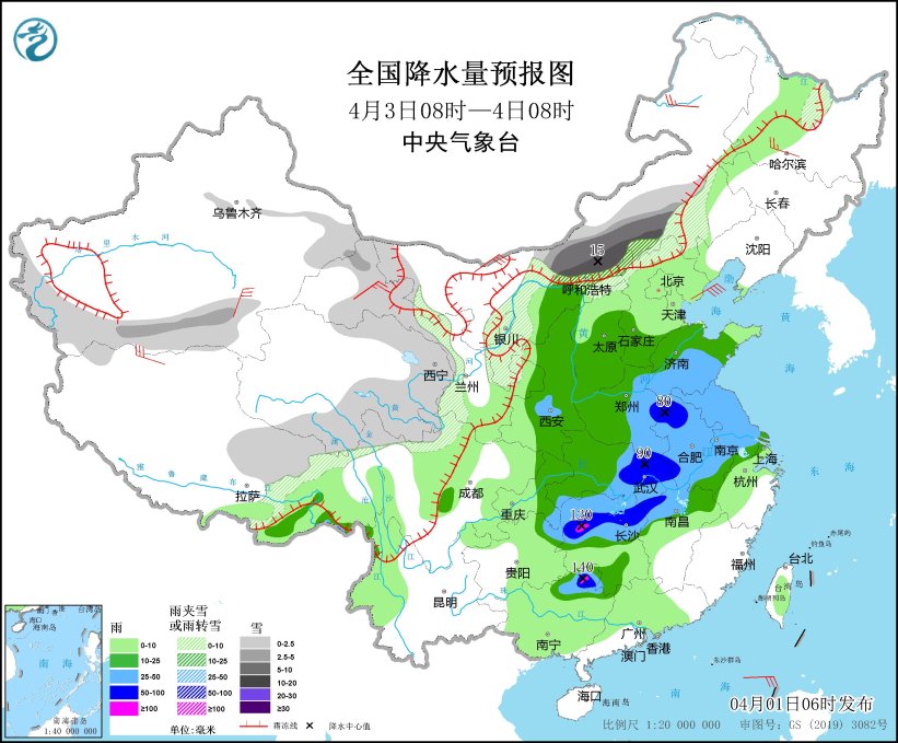 明天開始,大范圍雨雪將鋪展開來,內蒙古河套地區(qū)、西藏東部、西北地區(qū)東部、華北南部和西部、黃淮西部、江漢、江南北部、西南地區(qū)東北部等地部分地區(qū)有中到大雨,其中,河南南部、湖北北部和南部、湖南北部等地部分地區(qū)有暴雨或大暴雨。預計本輪雨雪天氣過程主要出現(xiàn)時段在4月2日至4日。