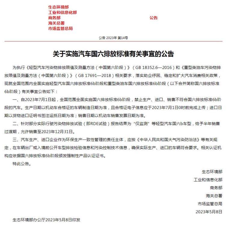 其中要求,自2023年7月1日起,全國(guó)范圍全面實(shí)施國(guó)六排放標(biāo)準(zhǔn)6b階段,禁止生產(chǎn)、進(jìn)口、銷售不符合國(guó)六排放標(biāo)準(zhǔn)6b階段的汽車。生產(chǎn)日期以機(jī)動(dòng)車合格證的車輛制造日期為準(zhǔn),且合格證電子信息應(yīng)于2023年7月1日0時(shí)前完成上傳;進(jìn)口日期以貨物進(jìn)口證明書簽注運(yùn)抵日期為準(zhǔn);銷售日期以機(jī)動(dòng)車銷售發(fā)票日期為準(zhǔn)。