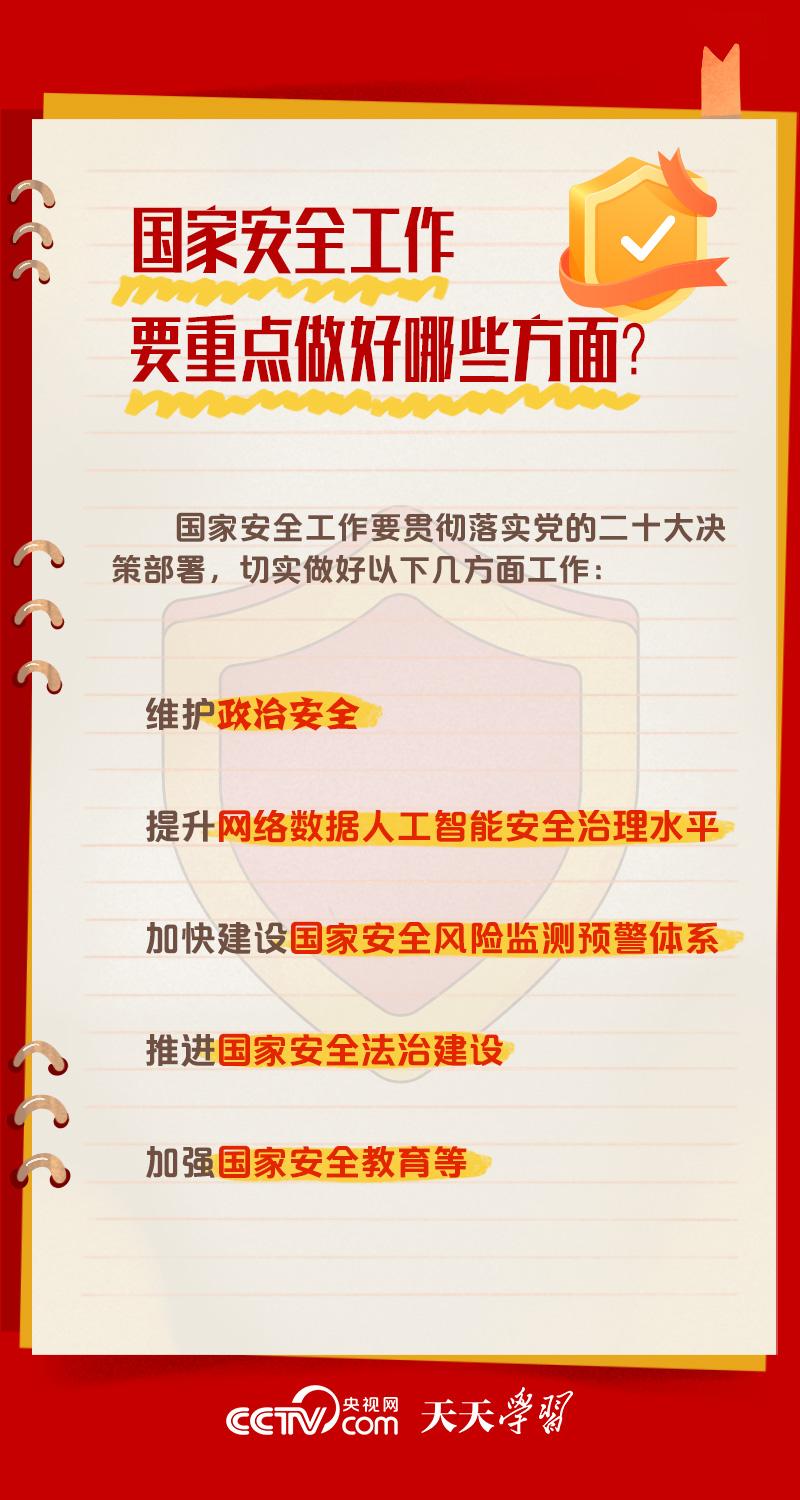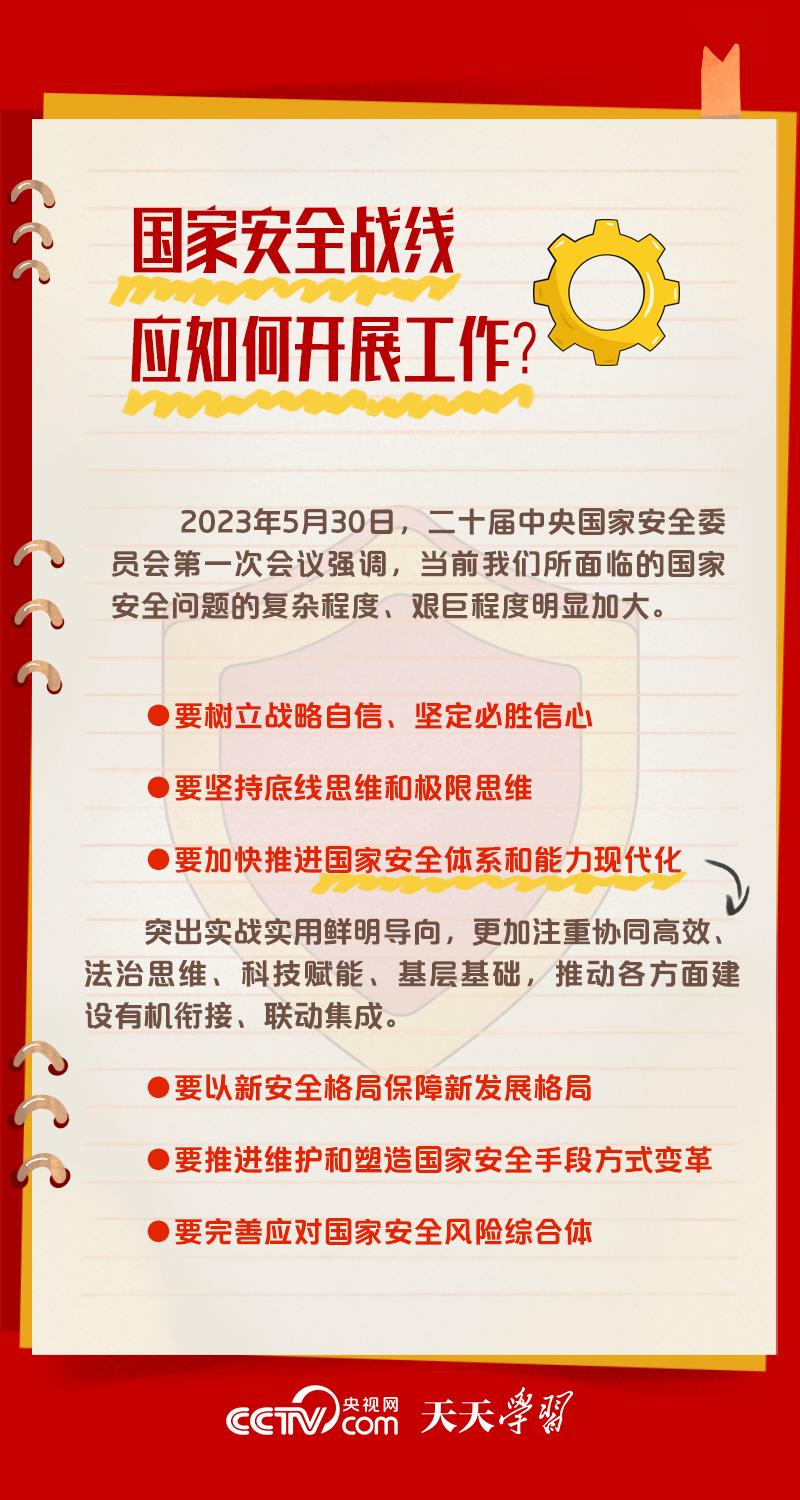 天天學習 5月30日,習近平總書記主持召開二十屆中央國家安全委員會第一次會議時強調,要全面貫徹黨的二十大精神,深刻認識國家安全面臨的復雜嚴峻形勢,正確把握重大國家安全問題,加快推進國家安全體系和能力現(xiàn)代化,以新安全格局保障新發(fā)展格局,努力開創(chuàng)國家安全工作新局面。