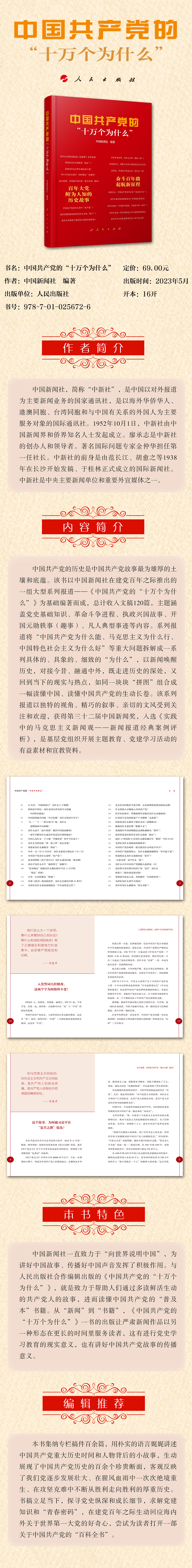 中國新聞社一直致力于“向世界說明中國”,為講好中國故事、傳播好中國聲音發(fā)揮了積極作用。與人民出版社合作編輯出版的《中國共產(chǎn)黨的“十萬個為什么”》,就是致力于幫助人們通過多讀鮮活生動的共產(chǎn)黨人的故事,進而讀懂中國共產(chǎn)黨的“普及本”書籍。從“新聞”到“書籍”,《中國共產(chǎn)黨的“十萬個為什么”》一書的出版讓嚴肅新聞作品以另一種形態(tài)在更長的時間里服務(wù)讀者,這有進行黨史學(xué)習(xí)教育的現(xiàn)實意義,也有講好中國共產(chǎn)黨故事的傳播意義。
