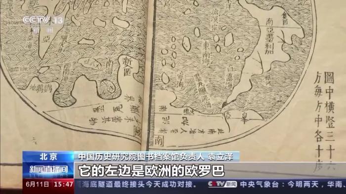 中國(guó)歷史研究院圖書(shū)檔案館負(fù)責(zé)人 袁立澤:這幅圖是16世紀(jì)末,西方第一批來(lái)華傳教士利瑪竇主持繪制的。把西方當(dāng)時(shí)先進(jìn)的制圖技術(shù)帶到了中國(guó),同時(shí)他有意識(shí)地吸收了中國(guó)的制圖經(jīng)驗(yàn)和理念。今天我們所熟悉的七大洲四大洋,在圖中應(yīng)該說(shuō)已經(jīng)標(biāo)示出了六大洲和三大洋,就是亞洲的亞細(xì)亞。它的左邊是歐洲的歐羅巴,南面就是今天的非洲叫利未亞,改變了以往以歐洲為中心的繪圖方式。它是中西文明交流互鑒的一個(gè)結(jié)晶和有力見(jiàn)證。