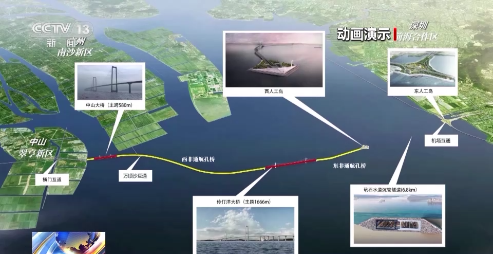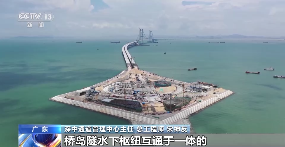 深中通道管理中心主任、總工程師 宋神友:未來,珠江西岸的人跟深圳機(jī)場以及前海實(shí)現(xiàn)快速交通轉(zhuǎn)換,就是通過在東岸設(shè)置了一個高速公路水下樞紐互通立交的形式,所以最終這個項(xiàng)目就是采用了橋島隧水下樞紐互通于一體的跨海集群工程。