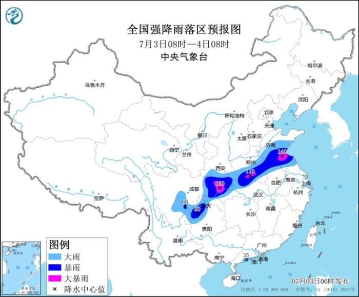 7月3日08時至4日08時,山東中南部、江蘇北部、安徽北部、河南東部和南部、湖北北部和西部、陜西南部、重慶、四川東部、貴州西北部、云南東北部以及廣東西南部沿海等地部分地區(qū)有大到暴雨,其中,山東南部、江蘇北部、河南南部、重慶北部、四川東北部等地局地有大暴雨(100~160毫米)。內(nèi)蒙古中西部、甘肅中北部、青海北部等地部分地區(qū)有4~6級風(fēng)。