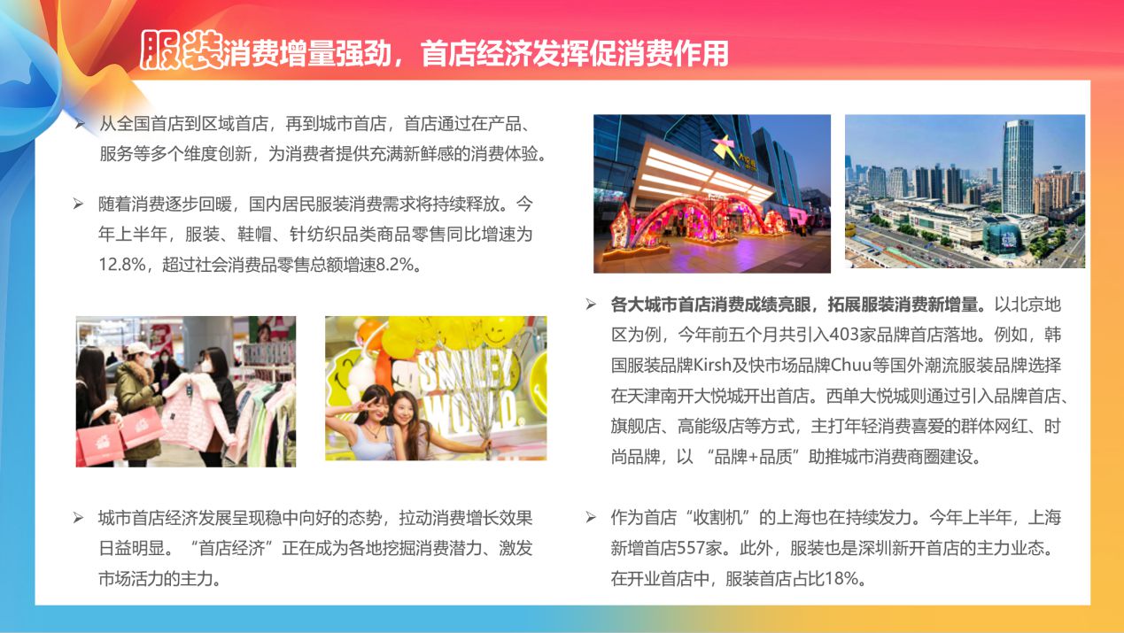 在服裝消費(fèi)方面,隨著消費(fèi)逐步回暖,國(guó)內(nèi)居民服裝消費(fèi)需求將持續(xù)釋放。以北京地區(qū)為例,今年前五個(gè)月共引入403家品牌首店落地。例如,韓國(guó)服裝品牌Kirsh及快市場(chǎng)品牌Chuu等國(guó)外潮流服裝品牌選擇在天津南開大悅城開出首店。西單大悅城則通過引入品牌首店、旗艦店、高能級(jí)店等方式,主打年輕消費(fèi)喜愛的群體網(wǎng)紅、時(shí)尚品牌,以“品牌+品質(zhì)”助推城市消費(fèi)商圈建設(shè)?!秷?bào)告》認(rèn)為,“首店經(jīng)濟(jì)”正在成為各地挖掘消費(fèi)潛力、激發(fā)市場(chǎng)活力的主力。