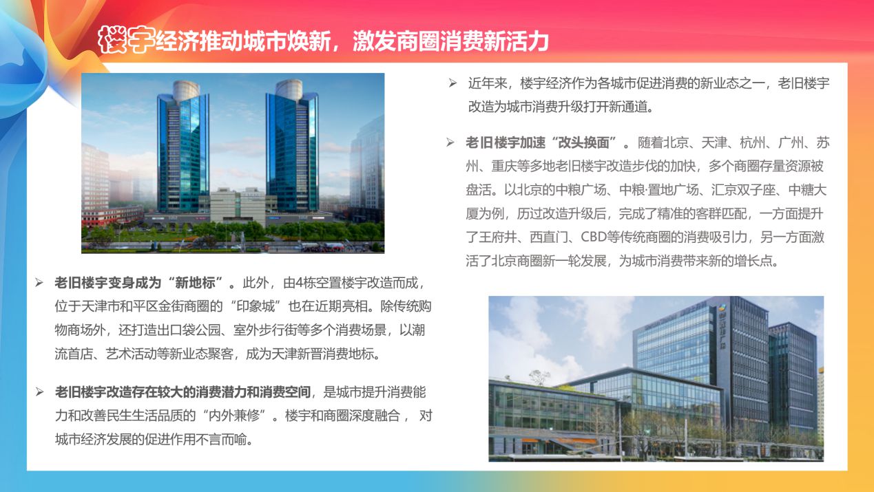 老舊樓宇改造存在較大的消費(fèi)潛力和消費(fèi)空間,是城市提升消費(fèi)能力和改善民生生活品質(zhì)的“內(nèi)外兼修”。《報(bào)告》梳理指出,隨著北京、天津、杭州、廣州、蘇州、重慶等多地老舊樓宇改造步伐的加快,多個(gè)商圈存量資源被盤活。以北京的中糧廣場(chǎng)、中糧·置地廣場(chǎng)、匯京雙子座、中糖大廈為例,通過舊改提升、輕(中)資產(chǎn)輸出等方式,打造高端商務(wù)地標(biāo),完成了精準(zhǔn)的客群匹配,一方面提升了王府井、西直門、CBD等傳統(tǒng)商圈的消費(fèi)吸引力,另一方面激活了北京商圈新一輪發(fā)展,推動(dòng)片區(qū)重構(gòu)和能級(jí)提升,為城市消費(fèi)帶來新的增長(zhǎng)點(diǎn)。