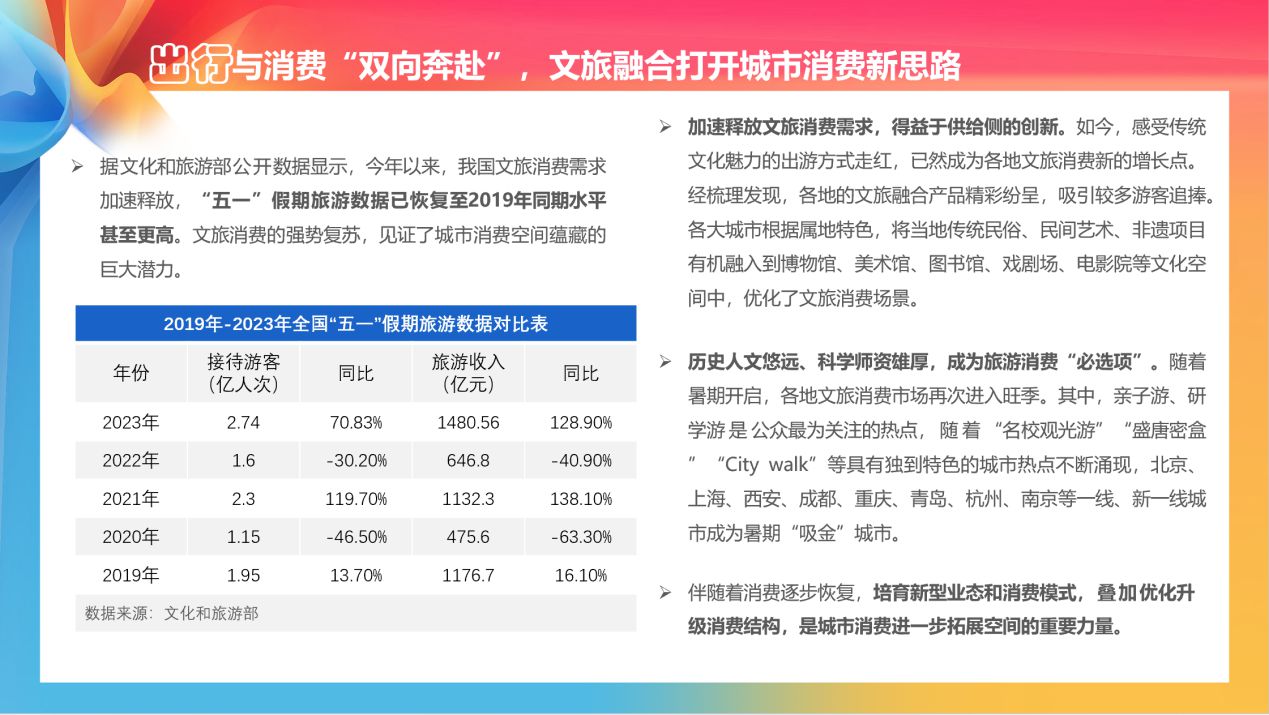 在出行方面,感受傳統(tǒng)文化魅力的出游方式走紅,已然成為各地文旅消費(fèi)新的增長(zhǎng)點(diǎn)。隨著暑期開啟,各地文旅消費(fèi)市場(chǎng)再次進(jìn)入旺季。其中,親子游、研學(xué)游是公眾最為關(guān)注的熱點(diǎn)。伴隨著消費(fèi)逐步恢復(fù),培育新型業(yè)態(tài)和消費(fèi)模式,疊加優(yōu)化升級(jí)消費(fèi)結(jié)構(gòu),是城市消費(fèi)進(jìn)一步拓展空間的重要力量。