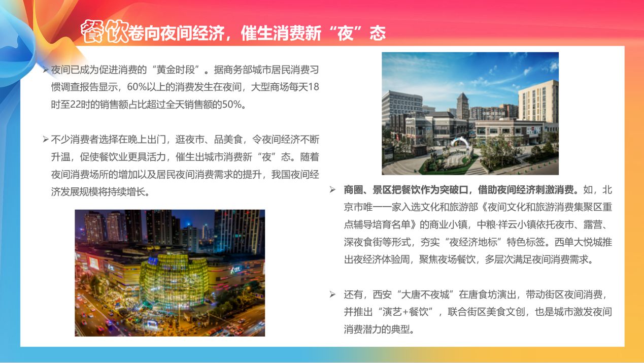 在餐飲消費(fèi)方面,隨著夜間消費(fèi)場(chǎng)所的增加以及居民夜間消費(fèi)需求的提升,我國(guó)夜間經(jīng)濟(jì)發(fā)展規(guī)模將持續(xù)增長(zhǎng)。例如,北京市唯一一家入選文化和旅游部《夜間文化和旅游消費(fèi)集聚區(qū)重點(diǎn)輔導(dǎo)培育名單》的商業(yè)小鎮(zhèn),中糧·祥云小鎮(zhèn)依托夜市、露營(yíng)、深夜食街等形式,構(gòu)建了“商圈+生活圈+夜經(jīng)濟(jì)”的消費(fèi)重地,榮獲北京十大商業(yè)品牌、消費(fèi)季品牌榜“十大文化消費(fèi)地標(biāo)”。西安“大唐不夜城”在唐食坊演出,帶動(dòng)街區(qū)夜間消費(fèi),并推出“演藝+餐飲”,聯(lián)合街區(qū)美食文創(chuàng),也是城市激發(fā)夜間消費(fèi)潛力的典型?!秷?bào)告》認(rèn)為,隨著夜間消費(fèi)場(chǎng)所的增加以及居民夜間消費(fèi)需求的提升,我國(guó)夜間經(jīng)濟(jì)發(fā)展規(guī)模將持續(xù)增長(zhǎng)。