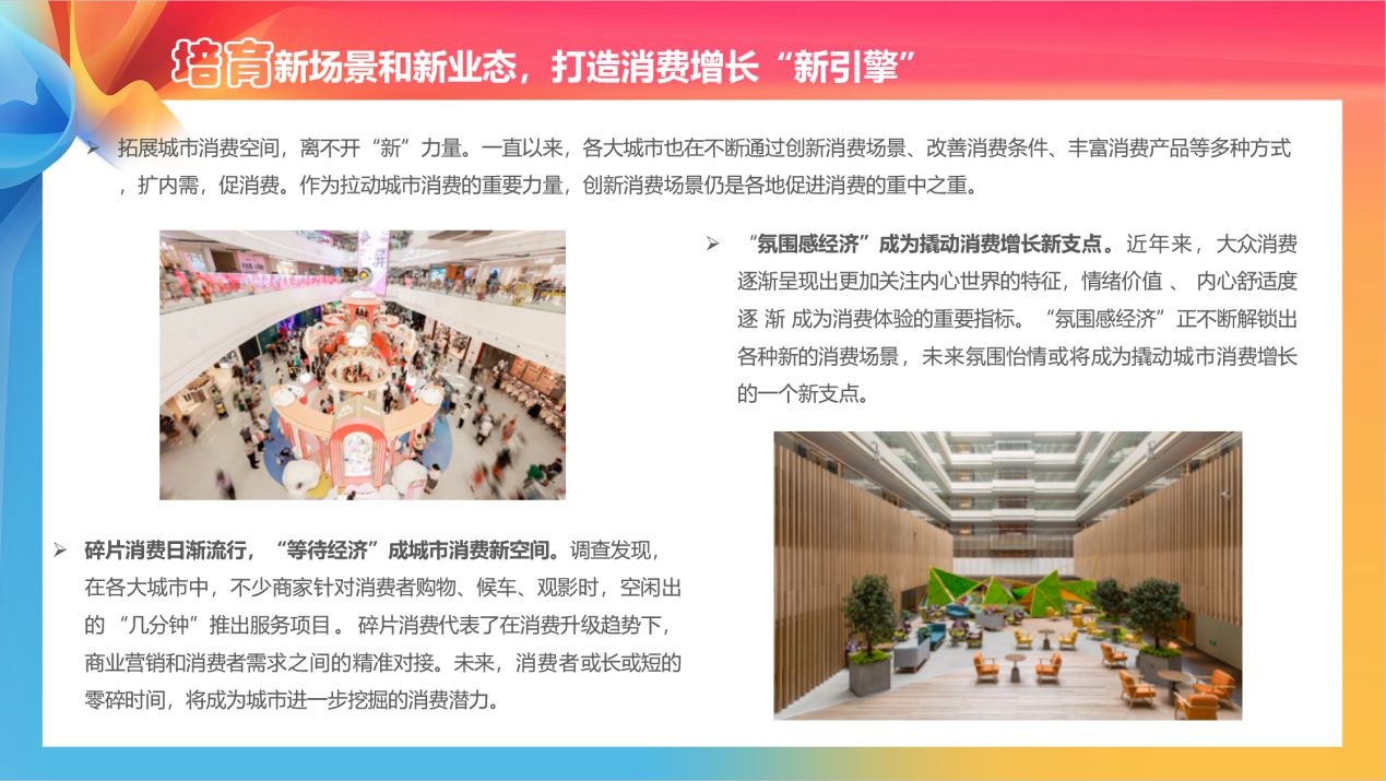 《報(bào)告》認(rèn)為,推動(dòng)現(xiàn)有消費(fèi)載體改造提升,進(jìn)行功能擴(kuò)展和業(yè)態(tài)創(chuàng)新,從單一功能的場(chǎng)所向文體商旅綜合體轉(zhuǎn)變,打造更多的綜合性消費(fèi)空間和場(chǎng)景,是各地打造“特色”“創(chuàng)意”“美學(xué)”“精致”城市名片,促進(jìn)消費(fèi)一大重要舉措。