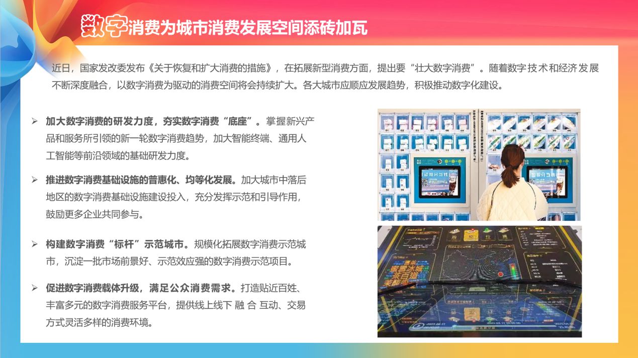 《報(bào)告》基于政府部門及行業(yè)協(xié)會(huì)公開信息、大數(shù)據(jù)技術(shù)應(yīng)用和智能化平臺(tái)數(shù)據(jù)、相關(guān)學(xué)術(shù)文獻(xiàn)、媒體報(bào)道、消費(fèi)者反饋等數(shù)據(jù)信息,從城市消費(fèi)現(xiàn)狀與趨勢(shì)、消費(fèi)業(yè)態(tài)和場(chǎng)景創(chuàng)新、消費(fèi)空間拓展三個(gè)維度進(jìn)行綜合分析,并提出針對(duì)性建議舉措,以期助力各城市、各企業(yè)培育消費(fèi)新增長(zhǎng)點(diǎn),開拓多樣化消費(fèi)業(yè)態(tài),釋放和激發(fā)出更大的消費(fèi)潛能,增強(qiáng)經(jīng)濟(jì)高質(zhì)量發(fā)展的內(nèi)生動(dòng)力。