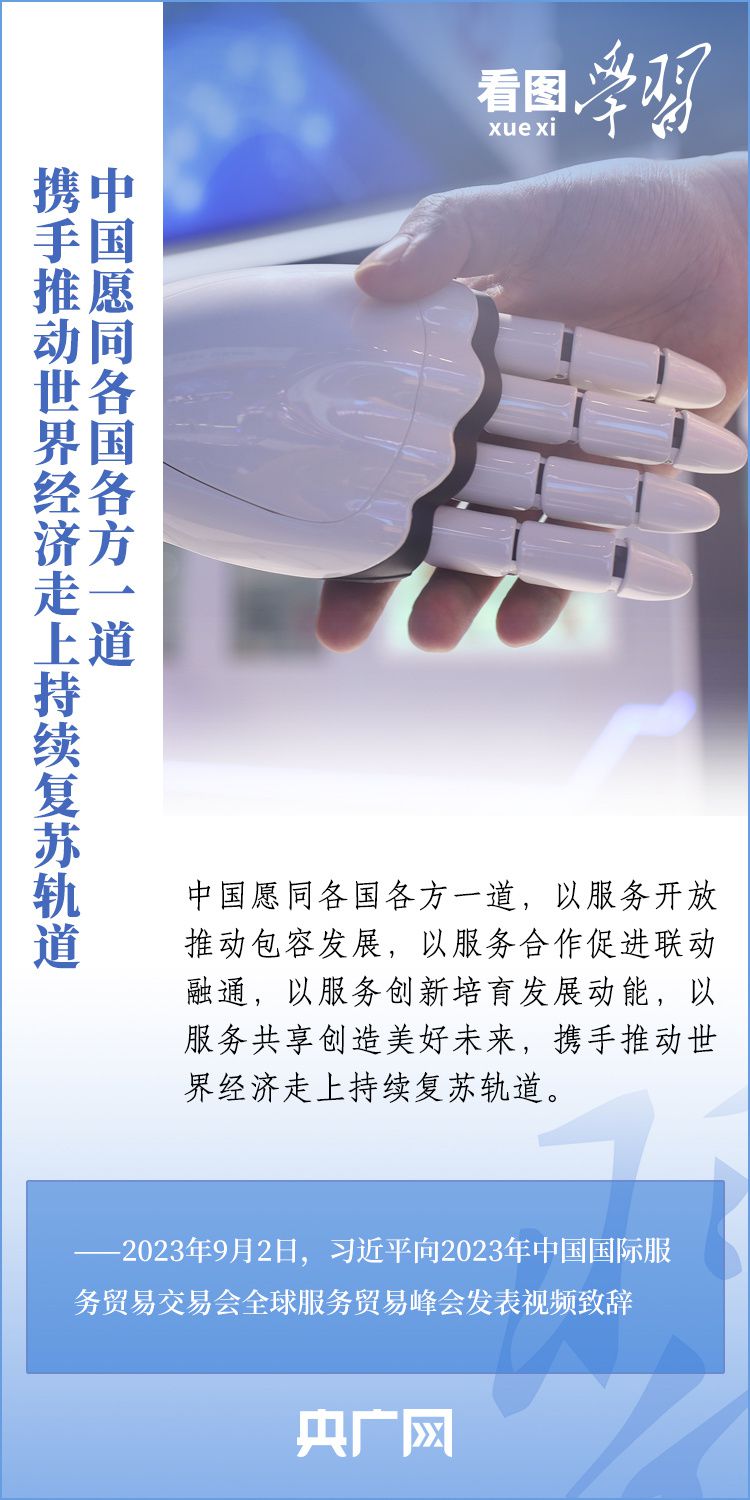 9月2日上午,以“開放引領(lǐng)發(fā)展 合作共贏未來(lái)”為主題的2023年中國(guó)國(guó)際服務(wù)貿(mào)易交易會(huì)在北京舉行。國(guó)家主席習(xí)近平向2023年中國(guó)國(guó)際服務(wù)貿(mào)易交易會(huì)全球服務(wù)貿(mào)易峰會(huì)發(fā)表視頻致辭表示,中國(guó)愿同各國(guó)各方一道,攜手推動(dòng)世界經(jīng)濟(jì)走上持續(xù)復(fù)蘇軌道。一起來(lái)學(xué)習(xí)!