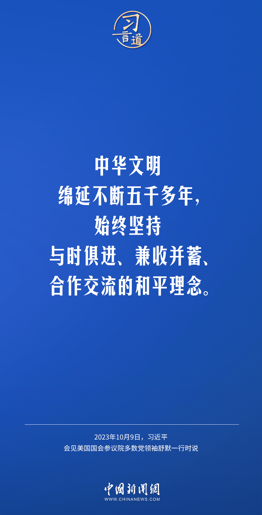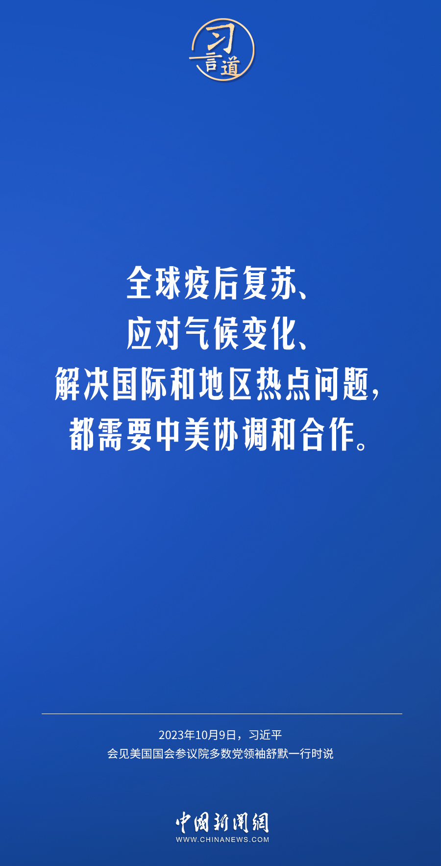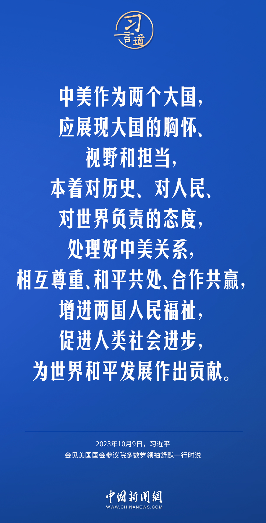 10月9日下午,國家主席習近平在人民大會堂會見美國國會參議院多數(shù)黨領袖舒默率領的美國國會參議院兩黨代表團。習近平指出——