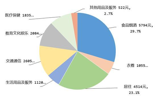 前三季度,全國居民人均食品煙酒消費(fèi)支出5794元,增長6.7%,占人均消費(fèi)支出的比重為29.7%;人均衣著消費(fèi)支出1055元,增長6.5%,占人均消費(fèi)支出的比重為5.4%;人均居住消費(fèi)支出4514元,增長6.4%,占人均消費(fèi)支出的比重為23.1%;人均生活用品及服務(wù)消費(fèi)支出1120元,增長7.4%,占人均消費(fèi)支出的比重為5.7%;人均交通通信消費(fèi)支出2605元,增長11.3%,占人均消費(fèi)支出的比重為13.3%;人均教育文化娛樂消費(fèi)支出2084元,增長16.4%,占人均消費(fèi)支出的比重為10.7%;人均醫(yī)療保健消費(fèi)支出1835元,增長15.0%,占人均消費(fèi)支出的比重為9.4%;人均其他用品及服務(wù)消費(fèi)支出522元,增長17.4%,占人均消費(fèi)支出的比重為2.7%。