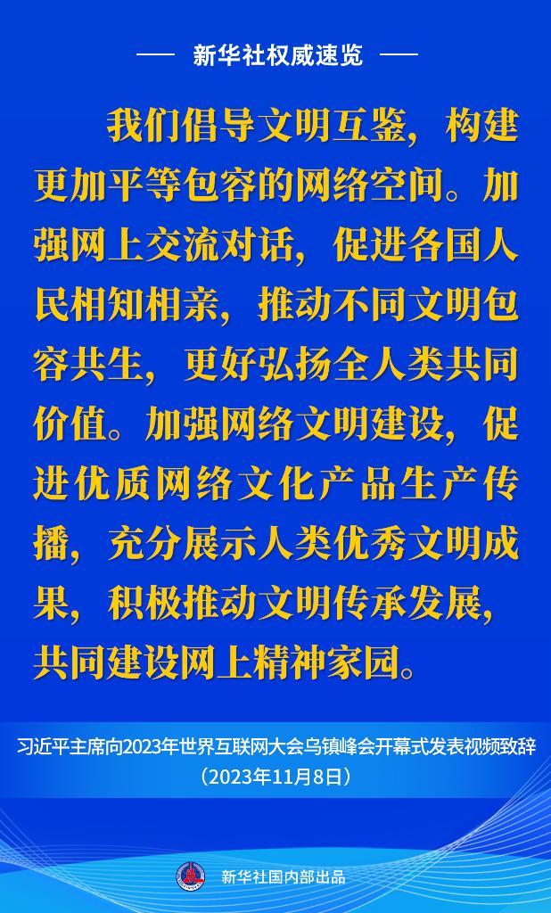新華社權(quán)威速覽丨習(xí)近平主席向2023年世界互聯(lián)網(wǎng)大會(huì)烏鎮(zhèn)峰會(huì)開幕式視頻致辭金句