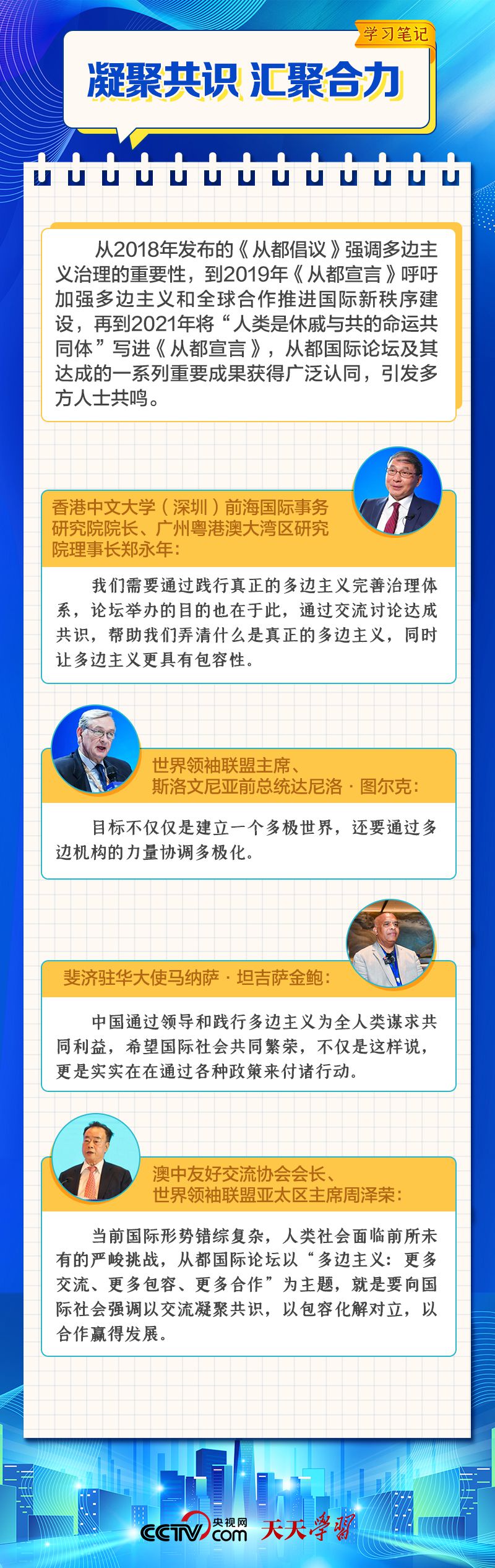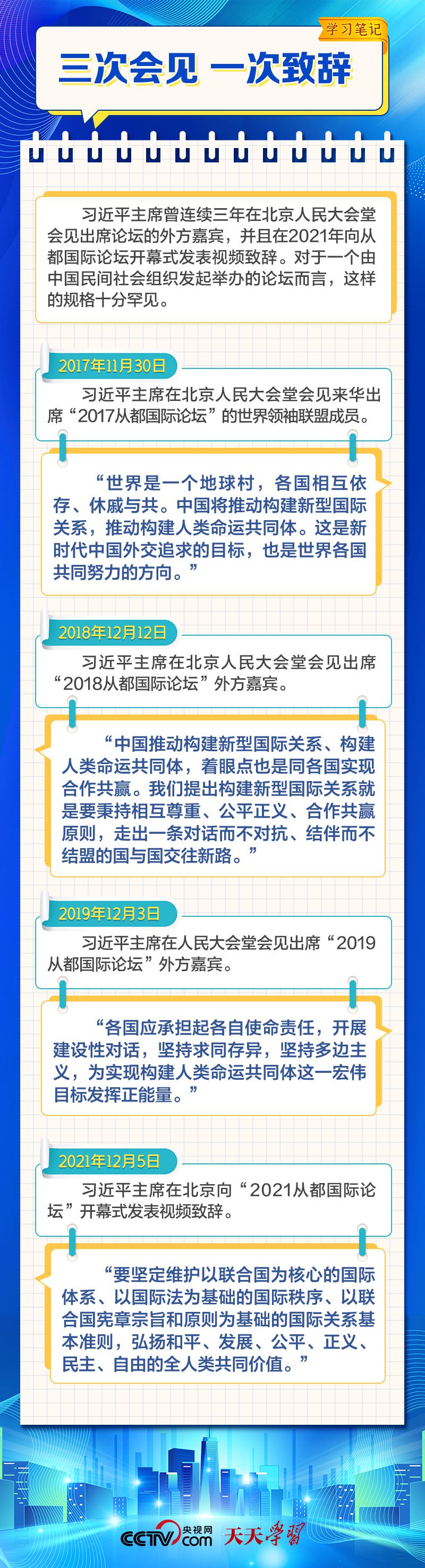 天天學(xué)習(xí) 12月4日,習(xí)近平主席在致“2023從都國際論壇”的賀信中強(qiáng)調(diào),面對前所未有的世界之變、時代之變和歷史之變,人類社會必須團(tuán)結(jié)起來,堅持互學(xué)互鑒、開放包容、合作共贏,弘揚(yáng)全人類共同價值,共同建設(shè)更加美好的世界。