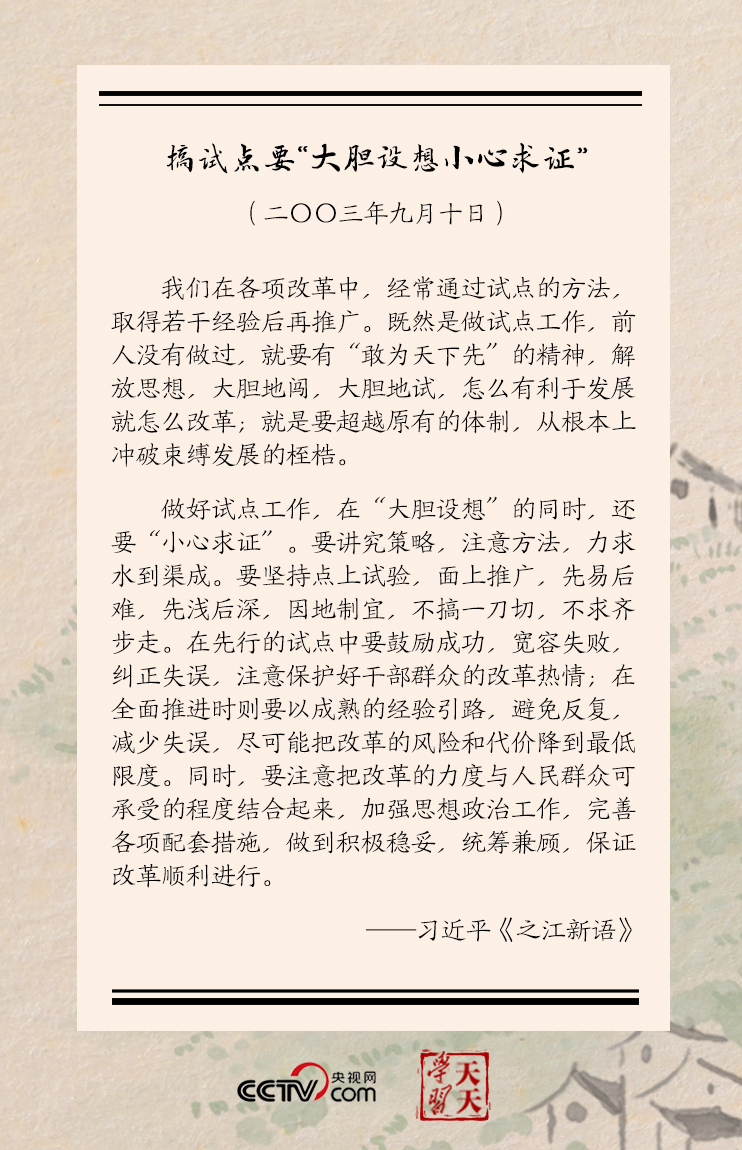 習(xí)近平還進一步分析,做好試點工作,在“大膽設(shè)想”的同時,還要“小心求證”……要堅持點上試驗,面上推廣,先易后難,先淺后深,因地制宜,不搞一刀切,不求齊步走……