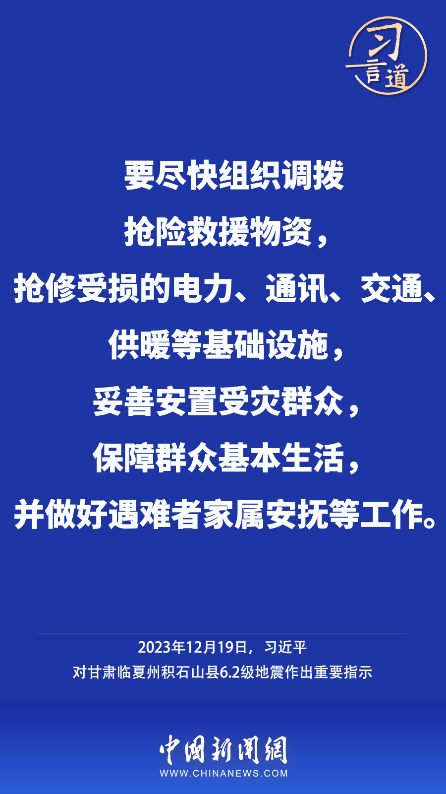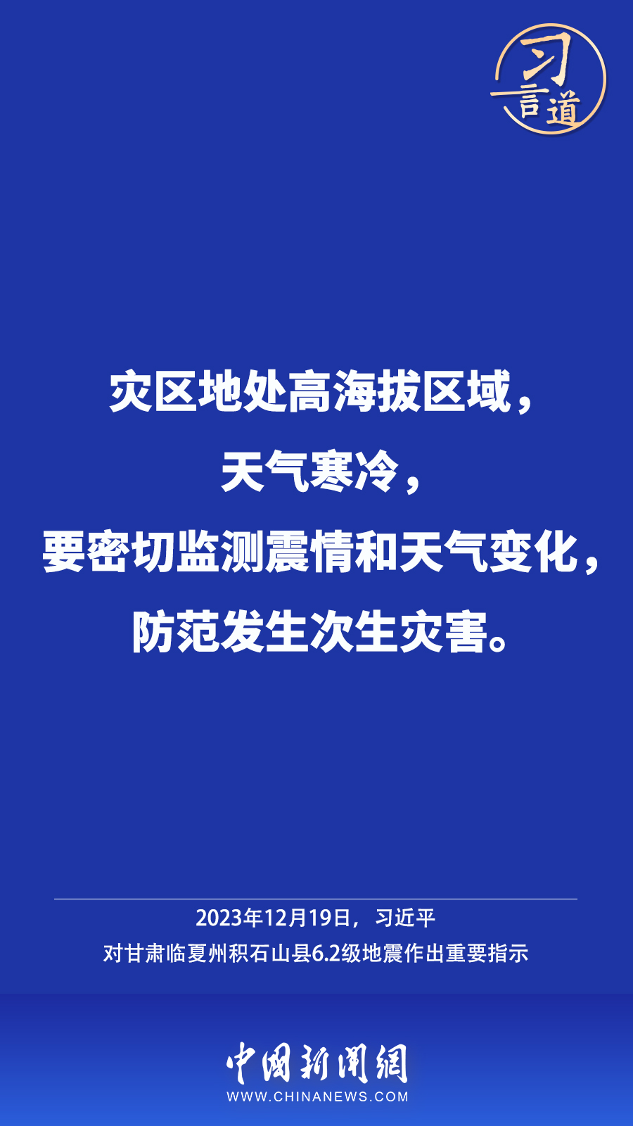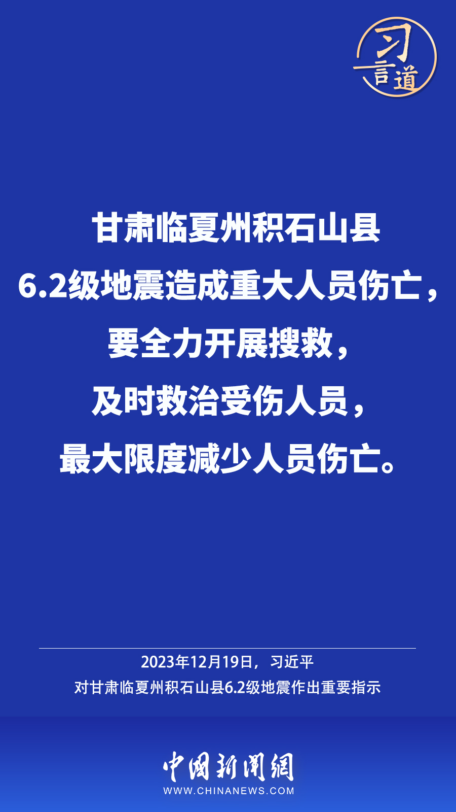 北京時(shí)間12月18日23時(shí)59分,甘肅臨夏州積石山縣發(fā)生6.2級(jí)地震,震源深度10公里。地震發(fā)生后,中共中央總書記、國(guó)家主席、中央軍委主席習(xí)近平高度重視并作出重要指示——