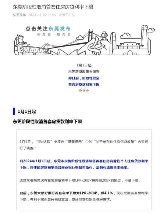 中新網(wǎng)1月2日電 據(jù)“東莞發(fā)布”微信公眾號消息,自2024年1月1日起,廣東省東莞市實(shí)施階段性取消轄區(qū)首套住房商業(yè)性個(gè)人住房貸款利率下限,具體的房貸利率由各商業(yè)銀行根據(jù)市場化、法制化原則自主確定。這意味著東莞現(xiàn)有首套房貸利率下限LPR-20BP將突破20BP的限定,不設(shè)下限。