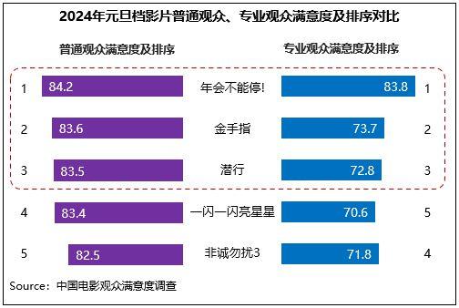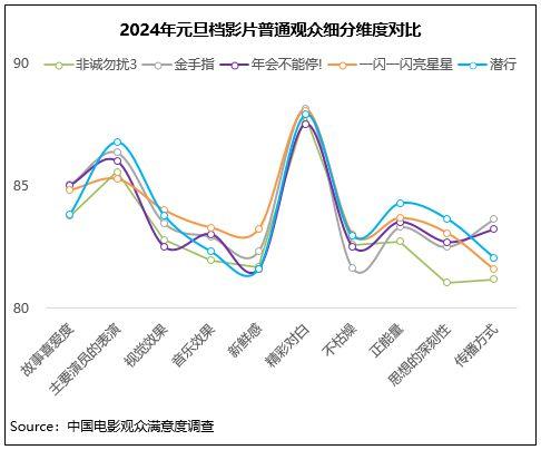 中國電影觀眾滿意度調(diào)查 2024年元旦檔調(diào)查結(jié)果顯示,元旦檔電影觀眾滿意度得分83.0分,環(huán)比增長0.2分。檔期以多元化且高契合度的影片供給陪伴觀眾跨年,得到了較高的滿意度評價,5部影片中有4部進入歷史調(diào)查19部元旦檔影片的滿意度前十,喜劇《年會不能停!》以84.2分領(lǐng)銜,《金手指》83.0分居第二位,《潛行》《一閃一閃亮星星》均超82分,《非誠勿擾3》超81分。