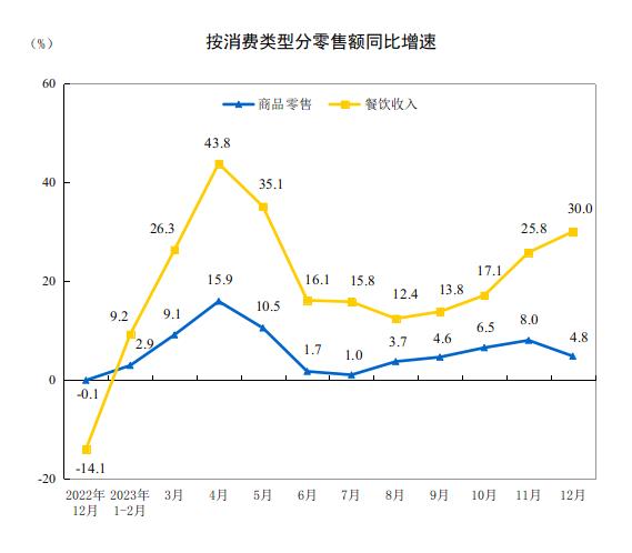 按消費(fèi)類型分,12月份,商品零售38145億元,同比增長4.8%;餐飲收入5405億元,增長30.0%。2023年,商品零售418605億元,比上年增長5.8%;餐飲收入52890億元,增長20.4%。