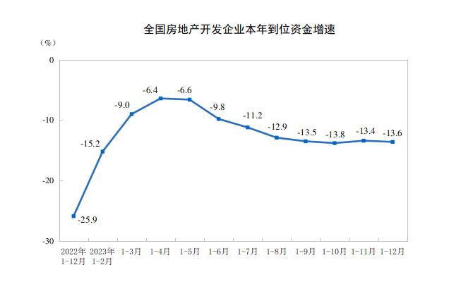 2023年,房地產(chǎn)開(kāi)發(fā)企業(yè)到位資金127459億元,比上年下降13.6%。其中,國(guó)內(nèi)貸款15595億元,下降9.9%;利用外資47億元,下降39.1%;自籌資金41989億元,下降19.1%;定金及預(yù)收款43202億元,下降11.9%;個(gè)人按揭貸款21489億元,下降9.1%。