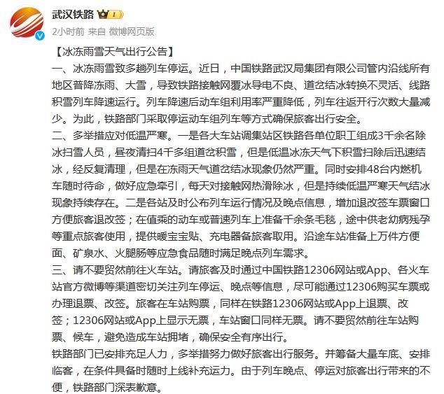 中國鐵路武漢局集團有限公司提醒旅客,不要貿然前往火車站。請旅客及時通過中國鐵路12306網(wǎng)站或App、各火車站官方微博等渠道密切關注列車停運、晚點等信息,盡可能通過12306購買車票或辦理退票、改簽。旅客在車站購票,同樣在鐵路12306網(wǎng)站或App上退票、改簽;12306網(wǎng)站或App上顯示無票,車站窗口同樣無票。請不要貿然前往車站購票、候車,避免造成車站擁堵,確保安全有序出行。