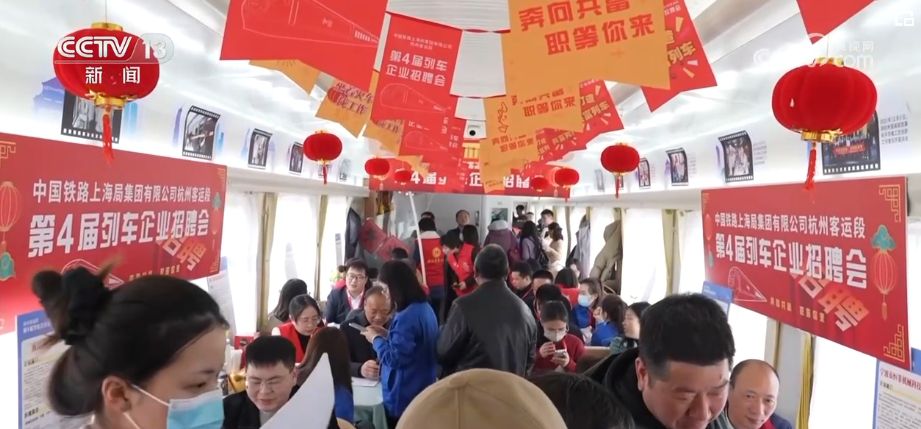 2月26日,在廣州白云開(kāi)往寧波的K210次列車(chē)上,一場(chǎng)流動(dòng)招聘會(huì)正在舉行。餐車(chē)?yán)?,十幾張火?chē)餐臺(tái)變成了招聘臺(tái),來(lái)自浙江杭州、寧波、湖州等地的企業(yè)招聘人員正在分發(fā)招聘宣傳單。前來(lái)咨詢(xún)招工信息的旅客圍聚在桌前,還有人現(xiàn)場(chǎng)填起了表格。