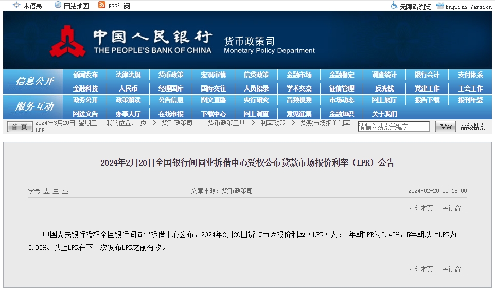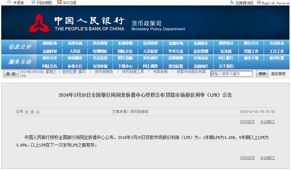中新網(wǎng)3月20日電 據(jù)中國人民銀行網(wǎng)站消息,中國人民銀行授權(quán)全國銀行間同業(yè)拆借中心公布,2024年3月20日貸款市場報價利率(LPR)為:1年期LPR為3.45%,5年期以上LPR為3.95%。以上LPR在下一次發(fā)布LPR之前有效。3月LPR與2月保持一致,未作調(diào)整。