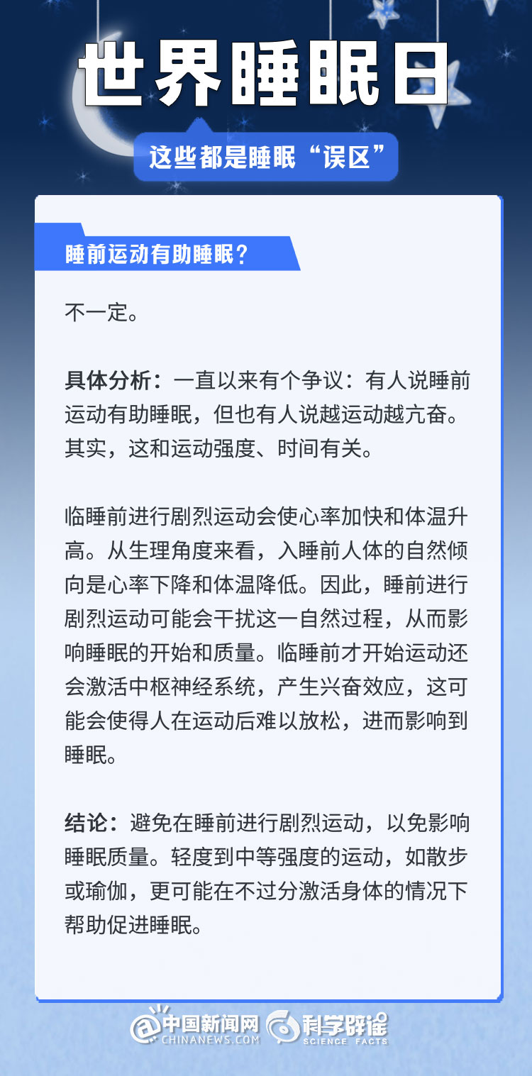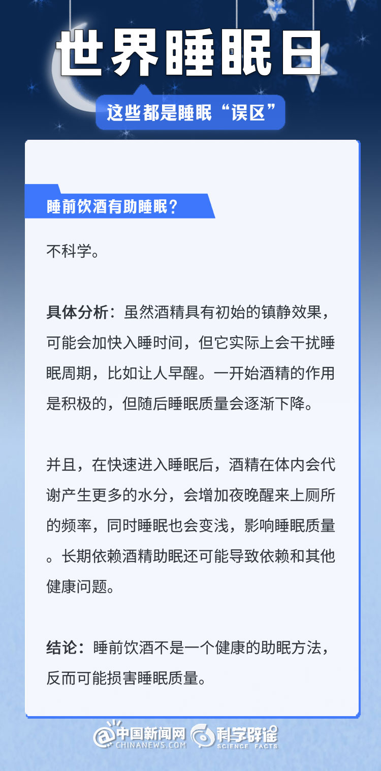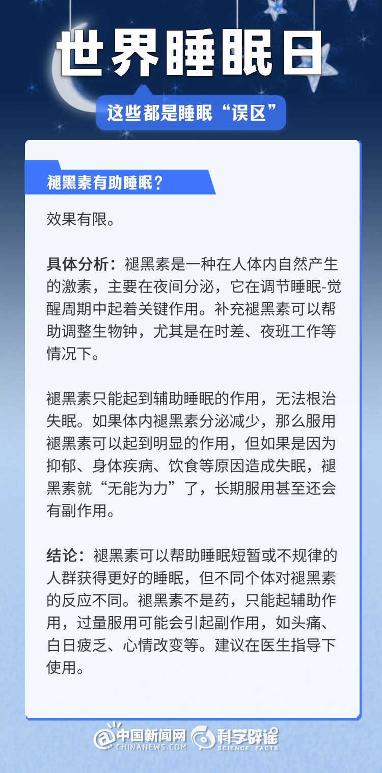 中新網(wǎng)3月21日電 《中國睡眠研究報告(2024)》顯示,2023年居民睡眠指數(shù)為62.61分,較2022年降低了5.16。去年的報告中,曾有近半數(shù)民眾每晚平均睡眠時長不足8小時(47.55%)。很多人正在經(jīng)受著睡眠問題的困擾,為了避免大家被誤導,我們總結(jié)了幾個生活中常見的睡眠誤區(qū),一起來了解一下吧!(來源:科學辟謠 中國新聞網(wǎng)微博)