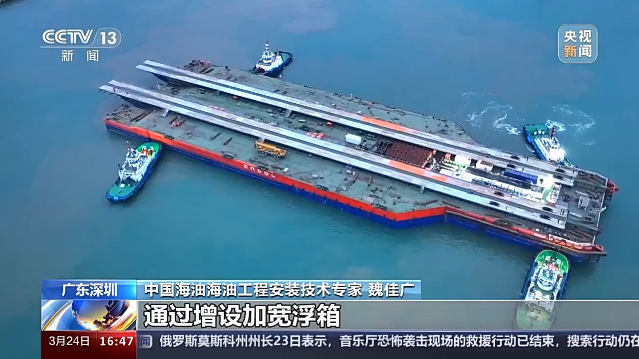 總臺央視記者 古峻嶺:這里是位于深圳東南方向240多公里處的流花油田海域,我們現(xiàn)在看到的這個大家伙,就是搭乘亞洲最大下水駁船——海洋石油229的?;柹詈?dǎo)管架。它相當(dāng)于海上平臺穩(wěn)穩(wěn)矗立在海底的“大長腿”,用鋼量接近于一整個“鳥巢”國家體育館。它是從廣東珠海出發(fā),經(jīng)過40多個小時的長距離拖航,剛剛抵達這一片施工海域。目前正在進行海上安裝前最后的準備工作。