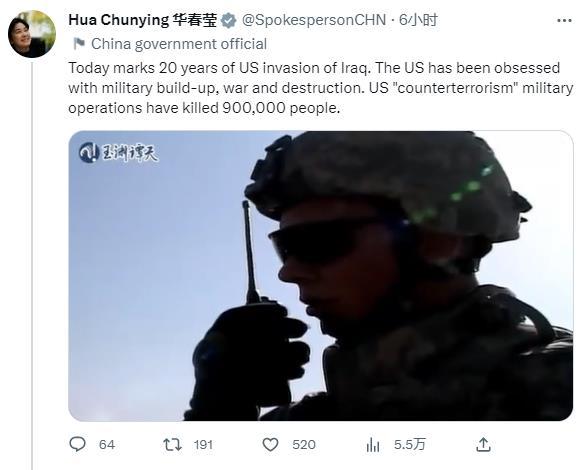 華春瑩在第一條推文中轉發(fā)了關于美國發(fā)動伊拉克戰(zhàn)爭的一個調(diào)查視頻,并配文稱,“今天是美國入侵伊拉克20周年。美國一直沉迷于軍事建設、戰(zhàn)爭和破壞。美國的‘反恐’軍事行動已造成90萬人死亡?!?/p>