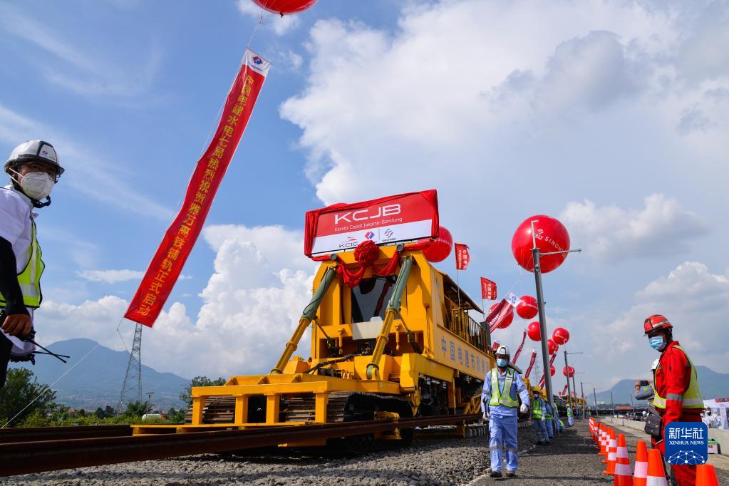 工作人員在印度尼西亞萬隆雅萬高鐵鋪軌施工現(xiàn)場(chǎng)作業(yè)(2022年4月20日攝)。新華社記者 徐欽 攝