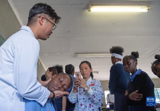 4月3日,在納米比亞溫得和克的伊曼紐爾·謝菲迪中學課堂上,一名學生體驗針灸。新華社發(fā)(穆薩·卡薩克攝)