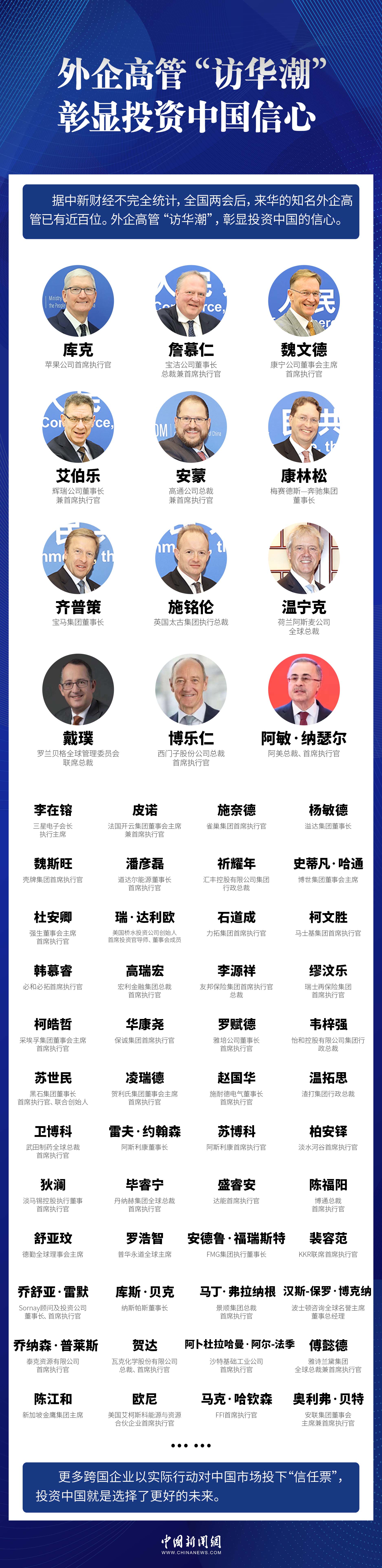中新網(wǎng)北京4月7日電 (記者 李金磊)時(shí)下,外企高管正掀起“訪華潮”。據(jù)中新財(cái)經(jīng)不完全統(tǒng)計(jì),全國(guó)兩會(huì)后,來(lái)華的知名外企高管已有近百位。