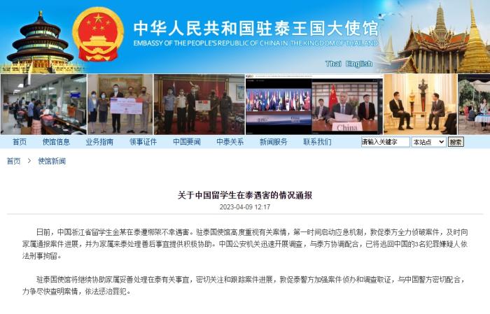 中新網(wǎng)4月9日電 中國駐泰國大使館9日發(fā)布“關(guān)于中國留學(xué)生在泰遇害的情況通報(bào)”,全文如下: