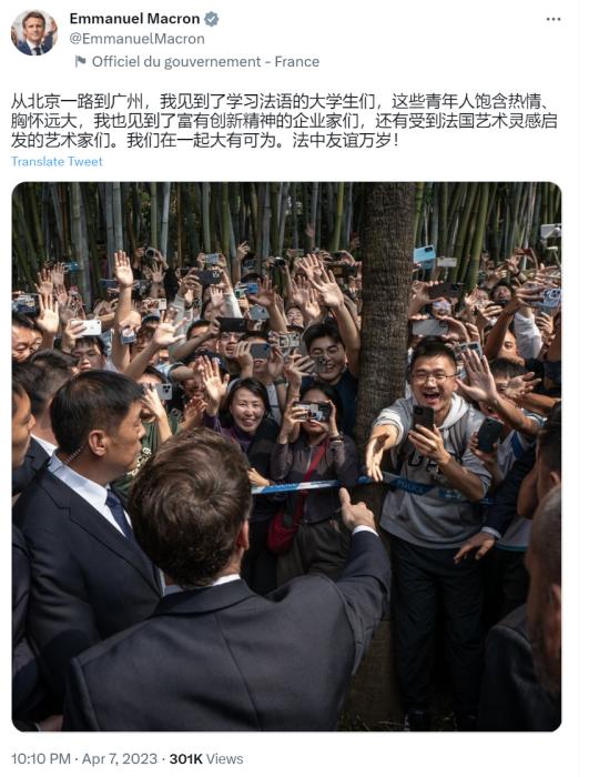馬克龍寫道,“從北京一路到廣州,我見到了學習法語的大學生們,這些青年人飽含熱情、胸懷遠大,我也見到了富有創(chuàng)新精神的企業(yè)家們,還有受到法國藝術靈感啟發(fā)的藝術家們。我們在一起大有可為。法中友誼萬歲!”