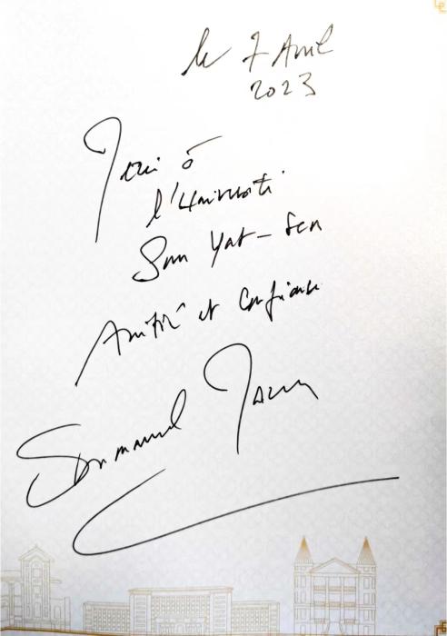 臨別之時,馬克龍留下感言,為中山大學題字:“感謝中山大學的友誼與信任。埃馬紐埃爾·馬克龍,2023年4月7日。”