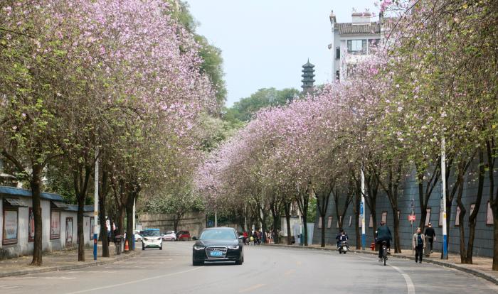 人間四月天,廣西柳州市近30萬(wàn)株洋紫荊盛放。放眼望去,整座城市沉浸在粉色的花海里。柳州市洋紫荊盛放密集路段,均被賞花游人“占領(lǐng)”,在花海里徜徉、打卡。