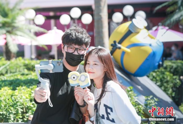 北京環(huán)球影城內(nèi),游客正在自拍。 中新社記者 賈天勇 攝