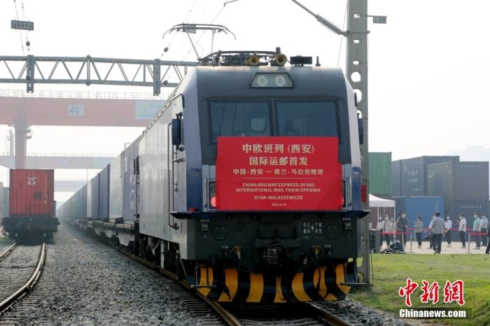 資料圖:2022年9月16日,中歐班列(西安)國際運郵專線首次開行,列車裝載著國際郵件、包裹、商業(yè)快件從西安國際港站駛出,經(jīng)阿拉山口口岸出境,將于約12天后抵達(dá)波蘭馬拉舍維奇,郵件再交由波蘭郵政轉(zhuǎn)運到歐洲各國。 中新社記者 張遠(yuǎn) 攝