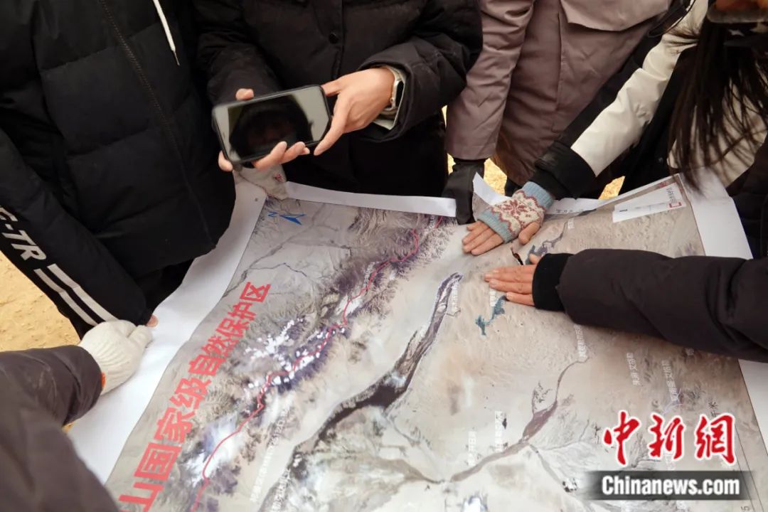 2023年4月,第三次新疆科考阿爾金山野外科考隊一行,前往阿爾金山國家級自然保護區(qū)庫木庫里沙漠的沙子泉考察調(diào)研,遭遇強沙塵暴天氣,科考隊員查看地圖。孫自法 攝