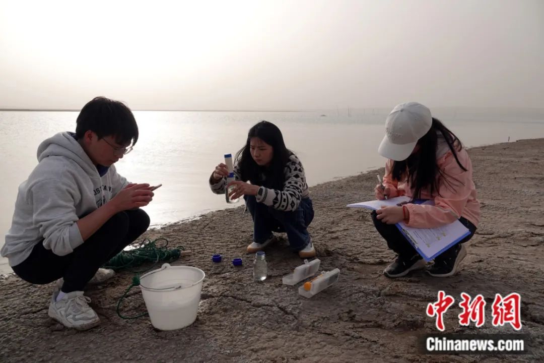 2023年3月,新疆若羌縣,參與第三次新疆科考任務(wù)的中國科學(xué)院新疆生態(tài)與地理研究所三名年輕研究生在途中采集水樣。孫自法 攝