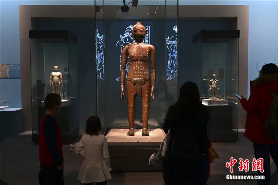 參觀者在中國國家博物館“智慧之光——中醫(yī)藥文化展”上觀看明仿宋針灸銅人。田雨昊 攝