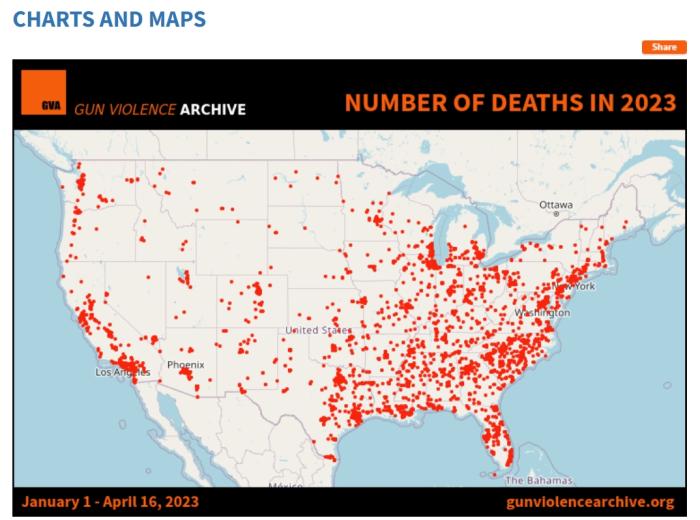 2023年1月1日至4月16日,美國槍支暴力事件分布圖。圖片來源:美國“槍支暴力檔案”網站截圖