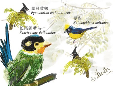 長(zhǎng)尾闊嘴鳥、黑冠黃鵯、冕雀,參賽隊(duì)員用漫畫展示在弄崗觀鳥的收獲。