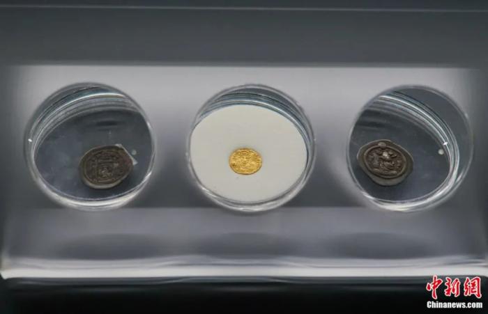青海省博物館藏、南北朝時(shí)期的波斯薩珊朝銀幣(兩側(cè) 西寧隍廟街出土)和羅馬金幣(中 都蘭縣香日德出土)。中新社記者 馬銘言 攝