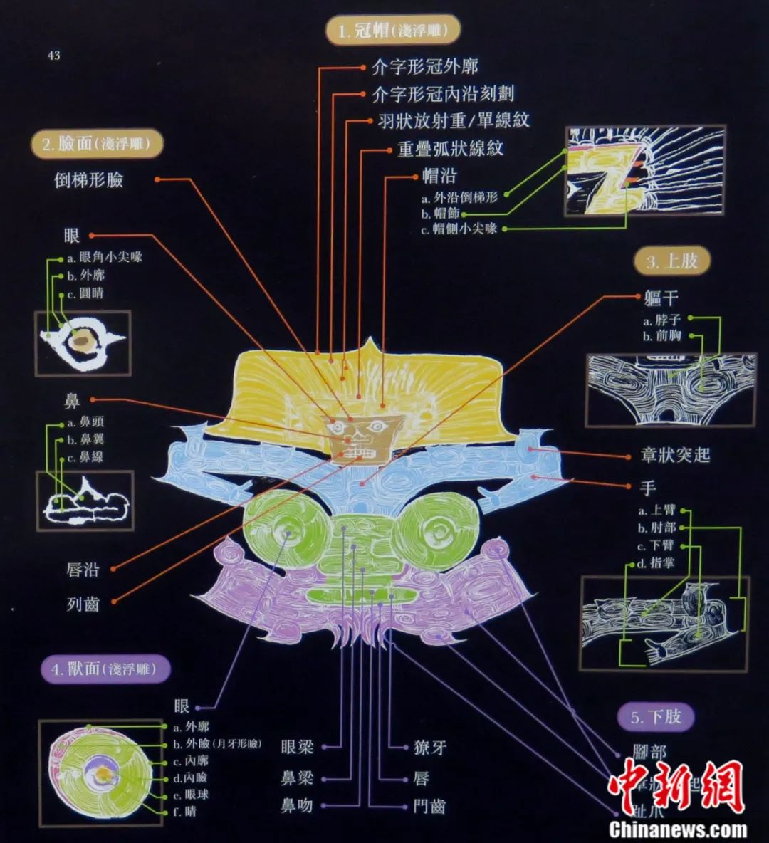 這個(gè)圖案的主體為“神人”,面部呈倒梯形,眼睛、鼻子、牙齒都非常寫實(shí)。“神人”頭上還戴有高聳的羽冠,內(nèi)層刻有連續(xù)卷云紋的帽飾,外層為放射狀羽翎大冠。“神人”的四肢都以陰紋細(xì)刻而成,上肢作抬臂、彎肘狀,五指平張?!吧袢恕钡纳硐率且恢环诘厣系纳瘾F(形似老虎),外框有橢圓形的眼瞼,之間以橋形凸面相連,有鼻梁和鼻翼,闊嘴內(nèi)有尖利的牙齒。